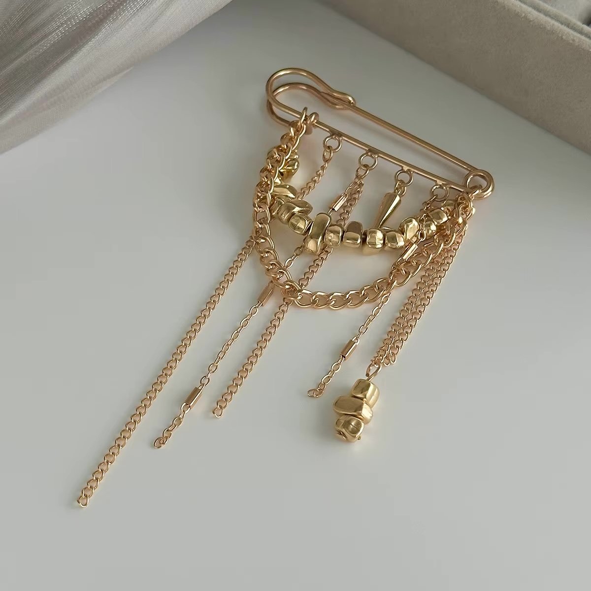 L'ensemble crée un bijou original à la fois chic et audacieux, idéal pour rehausser une veste, un manteau, un pull ou une chemise.